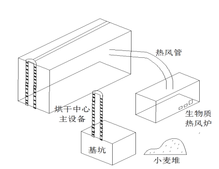 烘干中心由斗式提升機(jī)、生物質(zhì)熱風(fēng)爐(提供熱風(fēng))和烘干主設(shè)備(錐形倉,底部出料為螺旋推進(jìn)器)構(gòu)成,其工藝流程為:收購的谷物通過下料口進(jìn)入斗式提升機(jī),經(jīng)過兩級斗提進(jìn)入烘干主設(shè)備,谷物從錐形倉頂部下料,熱風(fēng)爐燃燒生物質(zhì)產(chǎn)生的熱風(fēng)從主設(shè)備中部進(jìn)入,與谷物逆向接觸烘干脫水。谷物烘干后,通過錐形倉底部螺旋推進(jìn)器進(jìn)入斗式提升機(jī),從平臺頂部出料,入庫待售。