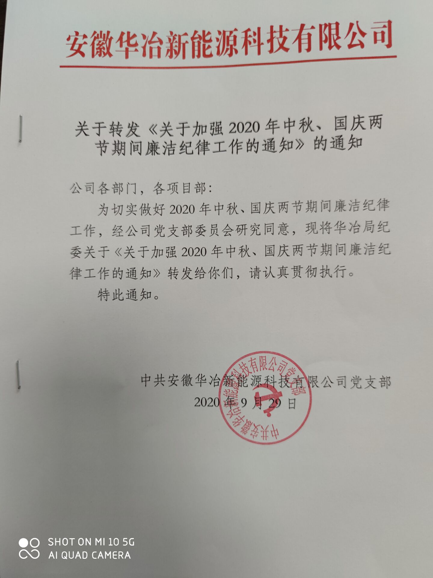 關(guān)于轉(zhuǎn)發(fā)《關(guān)于加強(qiáng)2020年中秋、國(guó)慶兩節(jié)期間廉潔紀(jì)律工作的通知》 發(fā)布時(shí)間:2020年9月29日 來(lái)源:安徽華冶新能源科技有限公司 閱讀次數(shù):2203