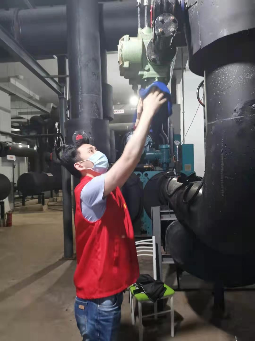 在天然居、水晶公館、萬象公館三個住宅小區(qū)夏季空調(diào)運營即將開啟,運管部工作人員十分忙碌之際,支部黨員、積極分子深入公司運管的機房,對水泵、機組等設備進行擦洗,對機房環(huán)境衛(wèi)生進行清理。有的負責高處清潔、有的擦拭設備、有的清除垃圾,大家互幫互助,齊心協(xié)力,忙得熱火朝天,經(jīng)過近兩個小時的努力,把機房整理的煥然一新。